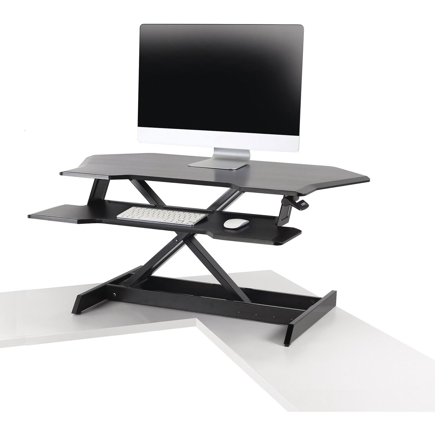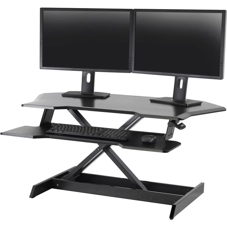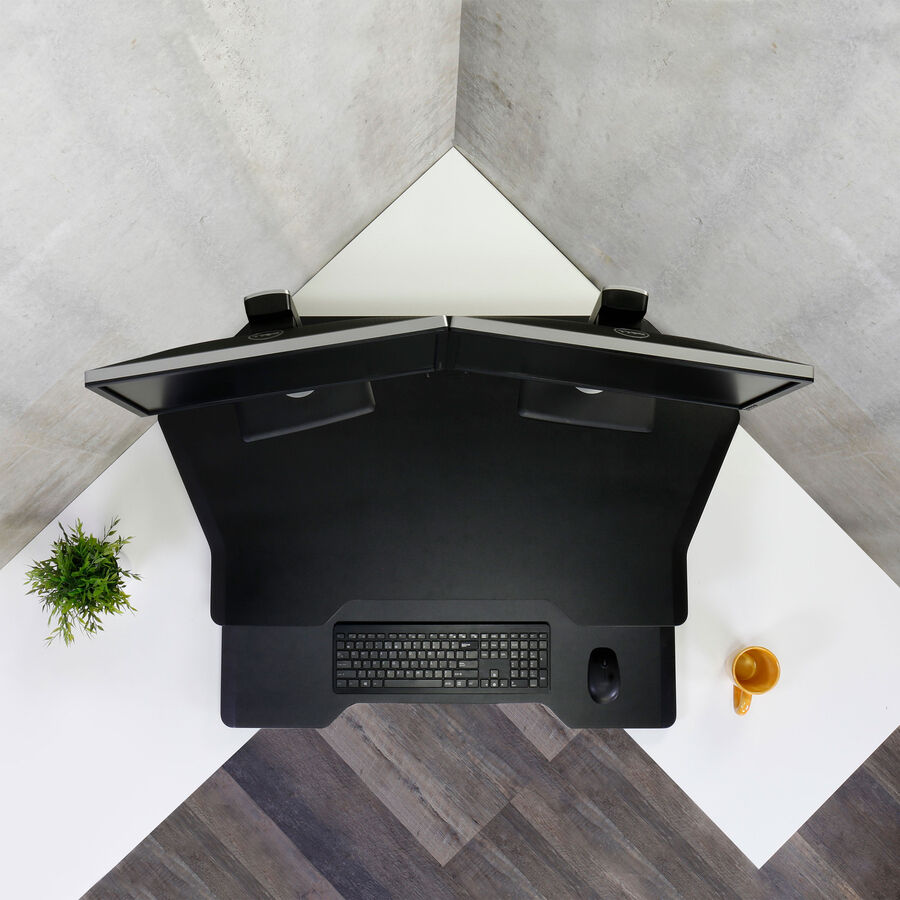 Designed for corner desk applications, this WorkFit standing desk has more worksurface and the largest keyboard platform of any WorkFit converter. The workstation fits two large monitors and easily adjusts between sitting and standing without bumping into cube panels or office walls. It ships fully assembled for an out-of-the-box solution.