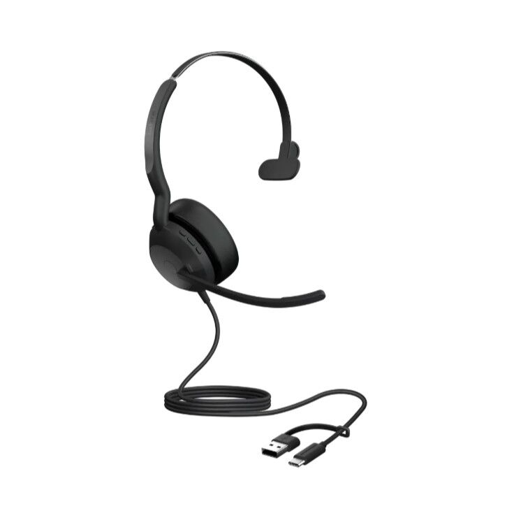 Jabra Evolve2 50, USB C/A UC Mono Headset EVOLVE2 50 Professional headset that’s wired up and ready to go. Designed for maximum comfort with Jabra Air Comfort technology › Silence your surroundings with Active Noise Cancellation (ANC) › Work-anywhere professionalism, with noisecancelling microphone technology › Optimized sound for professional and personal use › Fast plug-and-play and dual connectivity Certified for leading virtual meeting platforms › Professional headset that’s wired up and ready to go.