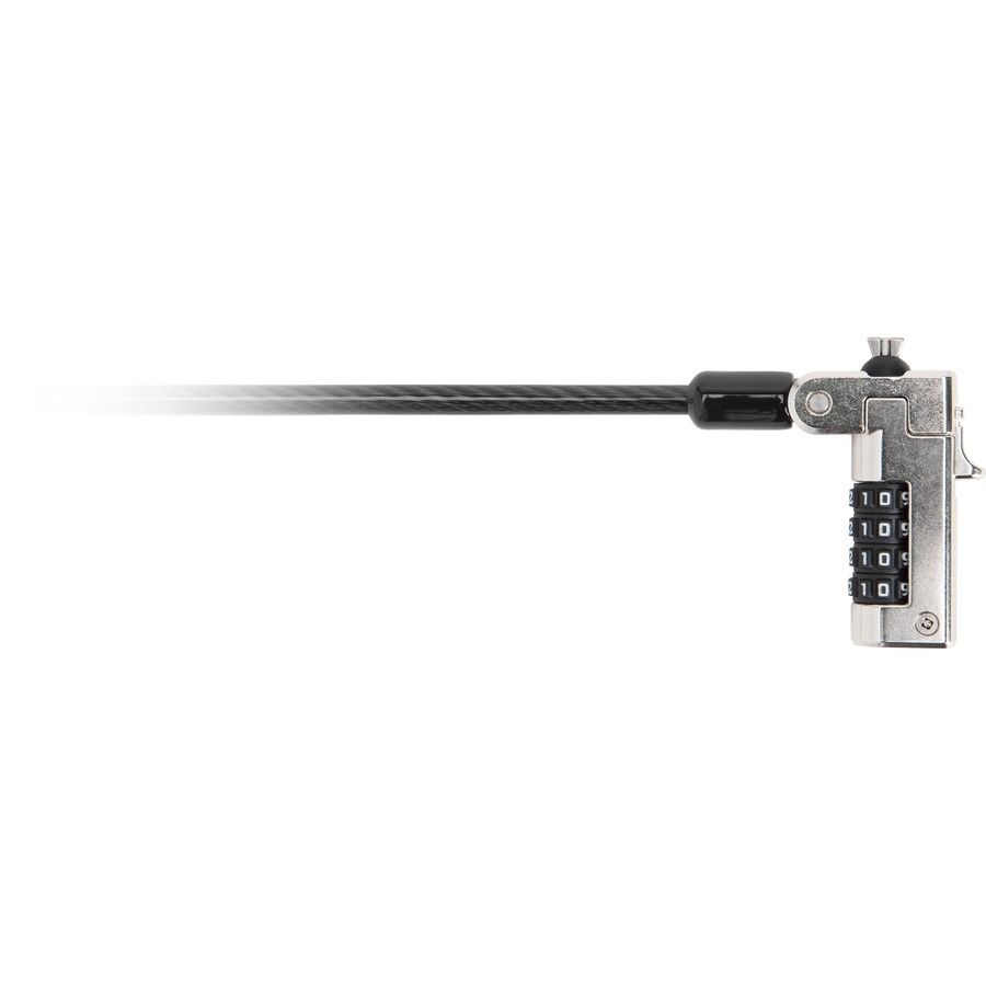 Combination laptop lock features a tough lock head that resists tampering for a reliable way to keep your device safe. Expanding side hooks grab the internal sides of the wedge-shaped lock slot to create a strong connection between the device frame and the lock. Carbon steel cable provides the same level of cut-resistance and theft-resistance as thicker cables. Re-engineered slider allows quick, easy engagement into your device. Resettable, four-wheel number code provides 10,000 possible combinations for greater options. Laptop lock is designed for laptops and tablets with a wedge-shaped lock slot.