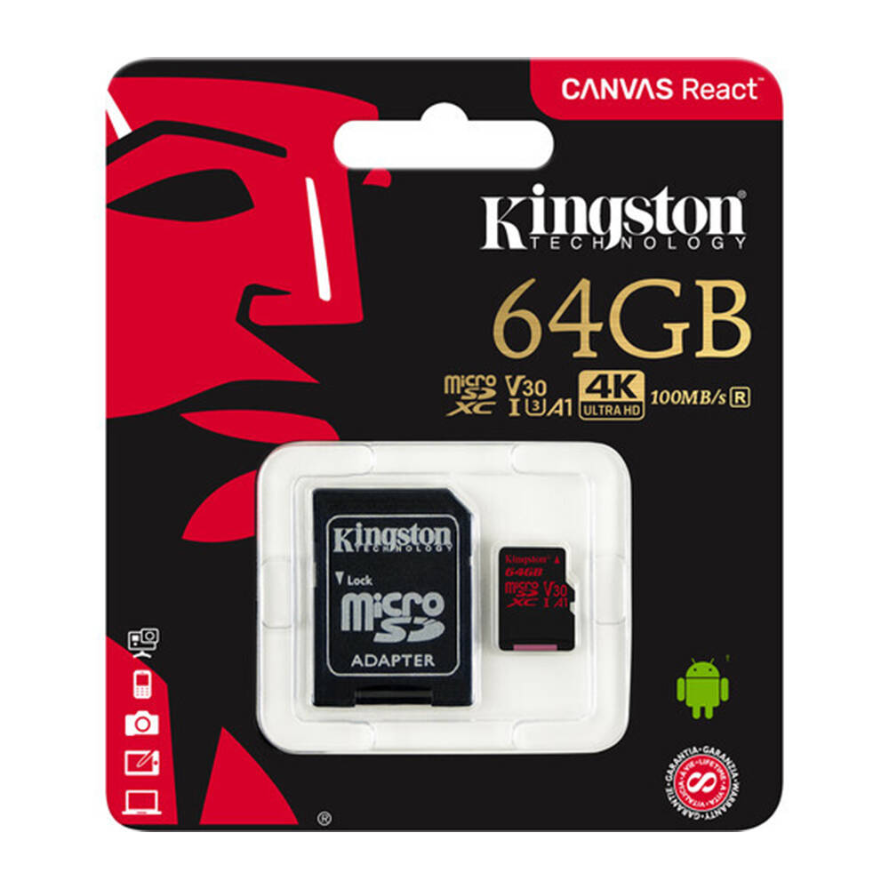 Kingston also engineered this Canvas React card to support the Application Performance Class 1 (A1) rating. Optimized to give Android users an improved mobile experience with faster mobile app performance, the A1 spec allows the card to manage random read input-output access per second (IOPS) operations so it can quickly open apps and process accompanying tasks, such as audio, graphics, saved profiles, and in-app permissions.