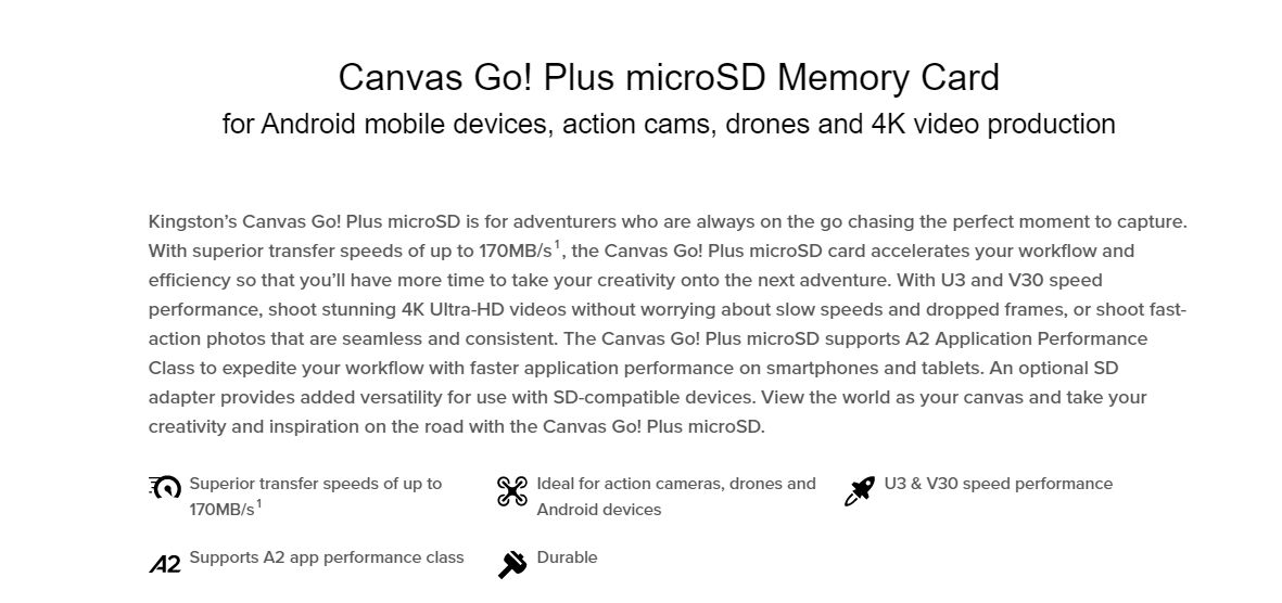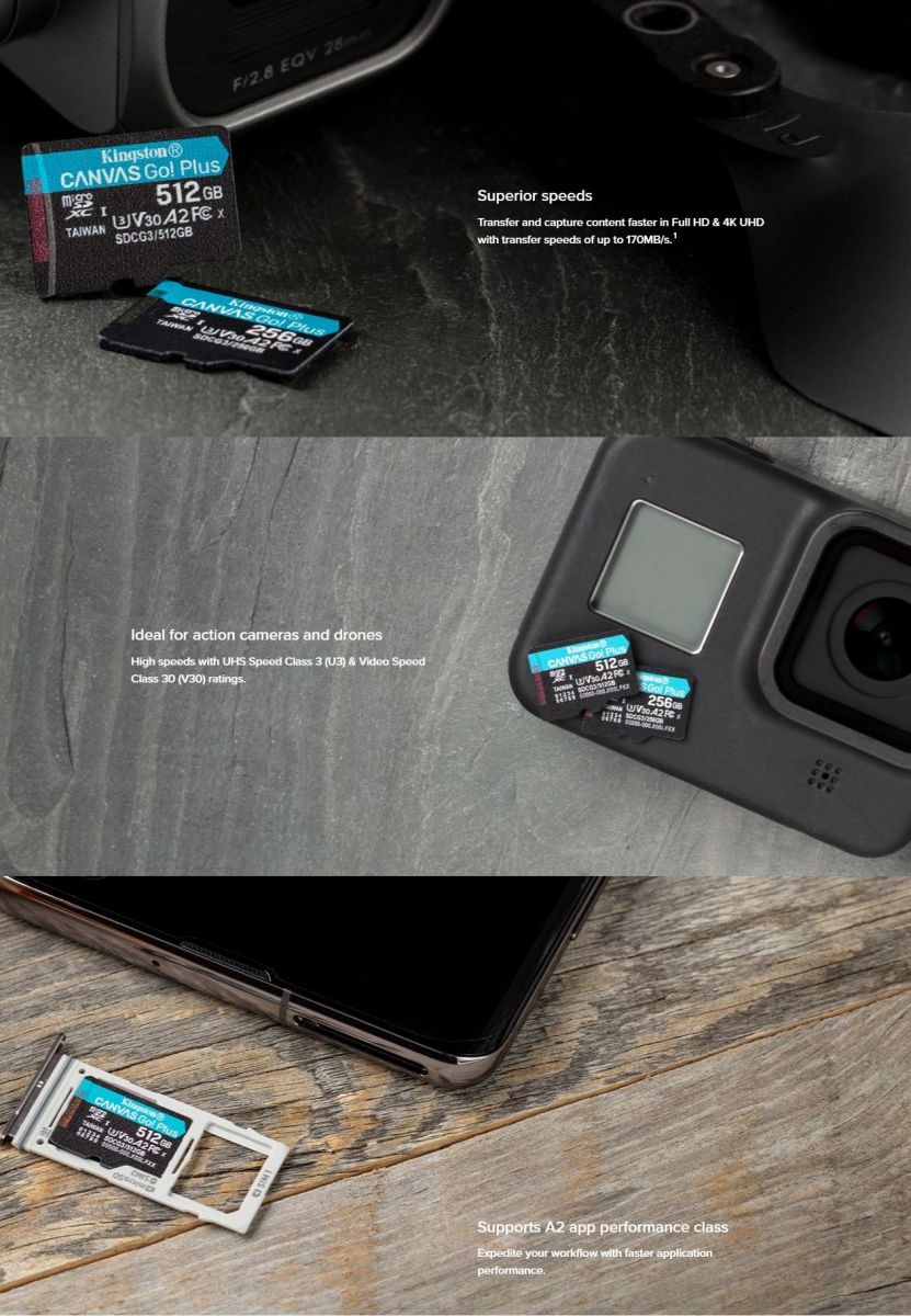 Kingston Micro SD Card Canvas Go Plus 128GB SDXC Mobile Phone 4K Action Camera U3 A2 170MB/S