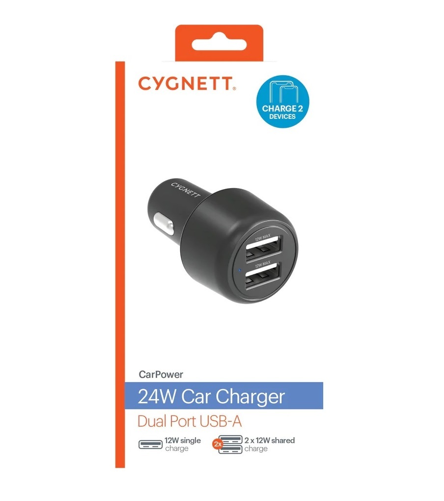 Cygnett CarPower 24W Dual Port (2x USB-A 12W) Car Charger - Black (CY3697CYCCH), Compact Design, Fast Charging Support, 24W total output
