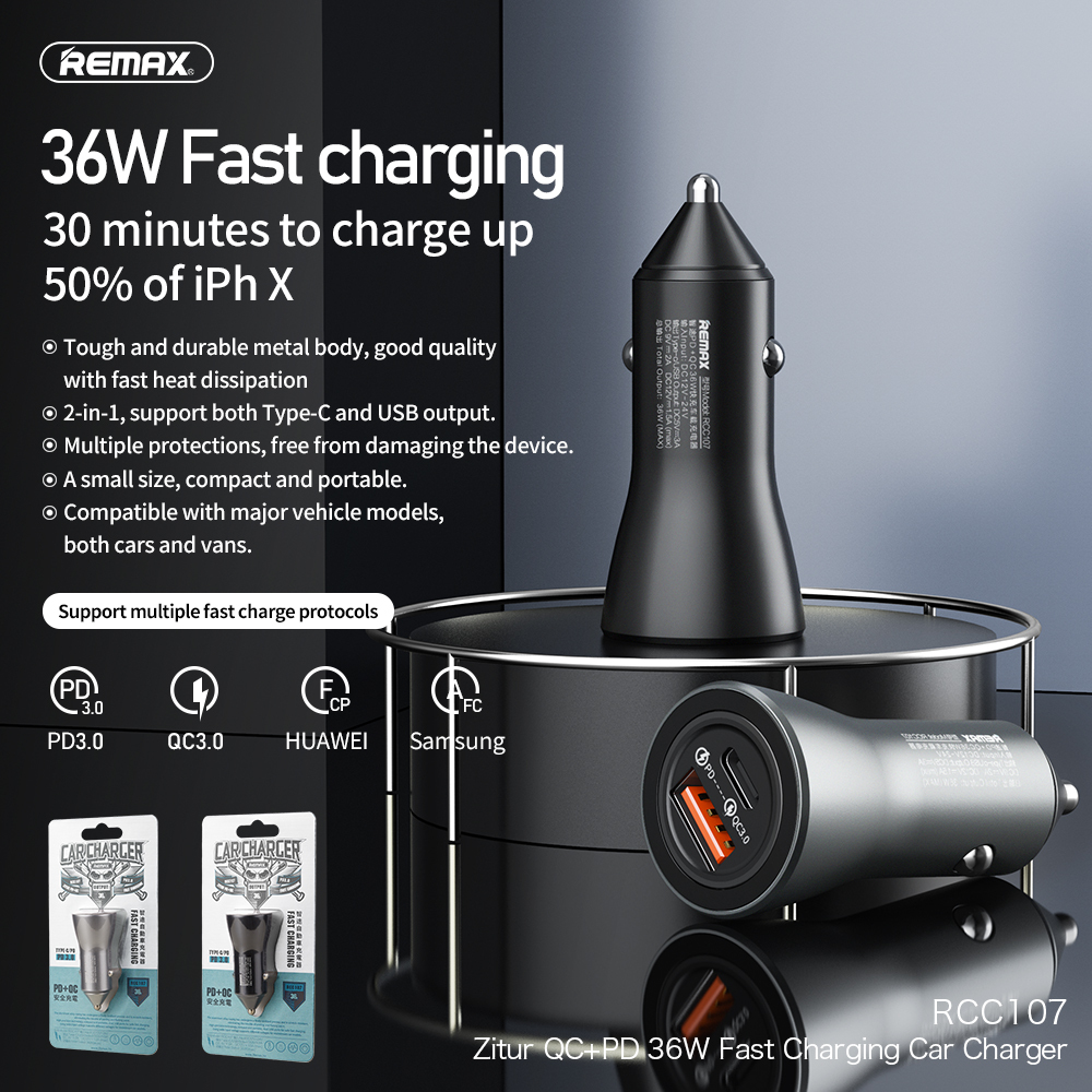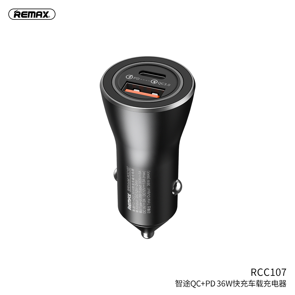 Universal Car Charger REMAX QC+PD 36W Dual Port Fast Charging Iphone Samsung Black