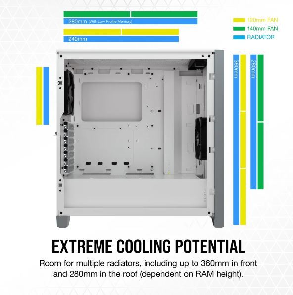 Extreme Cooling Potential: A spacious interior fits up to 6x 120mm or 4x 140mm cooling fans, along with multiple radiators including a 360mm in front and 280mm in the roof (dependent on RAM height).