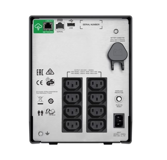 This product is part of the Smart-UPS range, an intelligent and efficient network power protection offer from entry-level to scalable runtime. This 1500VA/900W line-interactive UPS provides pure sine wave power to support critical electronics during power disruptions. The tower mount SMC has a SmartConnect port for cloud-based remote power monitoring, UPS firmware upgrades, remote diagnostics and email notifications with recommended actions. The PowerChute Business Edition provides unattended shutdown of servers and workstations via serial or USB cables. Ideal for entry-level servers, networks, business VoIP, retail point-of-sale, edge networks and business desktops. It conforms to CE, C-Tick, GOST, VDE, and UL 1778.