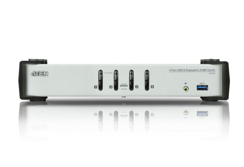 The ATEN CS1914 4-Port USB 3.0 DisplayPort KVMP™ Switch provides the latest innovations in desktop KVM switching technology to meet the increasing demand of higher video quality and file transfer rates on modern computers. The CS1914 provides superior resolutions up to 3840 x 2160 @ 30 Hz, a SuperSpeed USB 3.1 Gen 1 hub with 5 Gbps transfer rates and enhanced user-friendly operations.