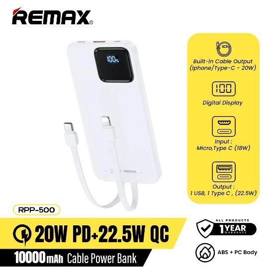Power Bank REMAAX Suji Series PD20W+QC22.5W Fast Charging 10000mAh RPP-500 White