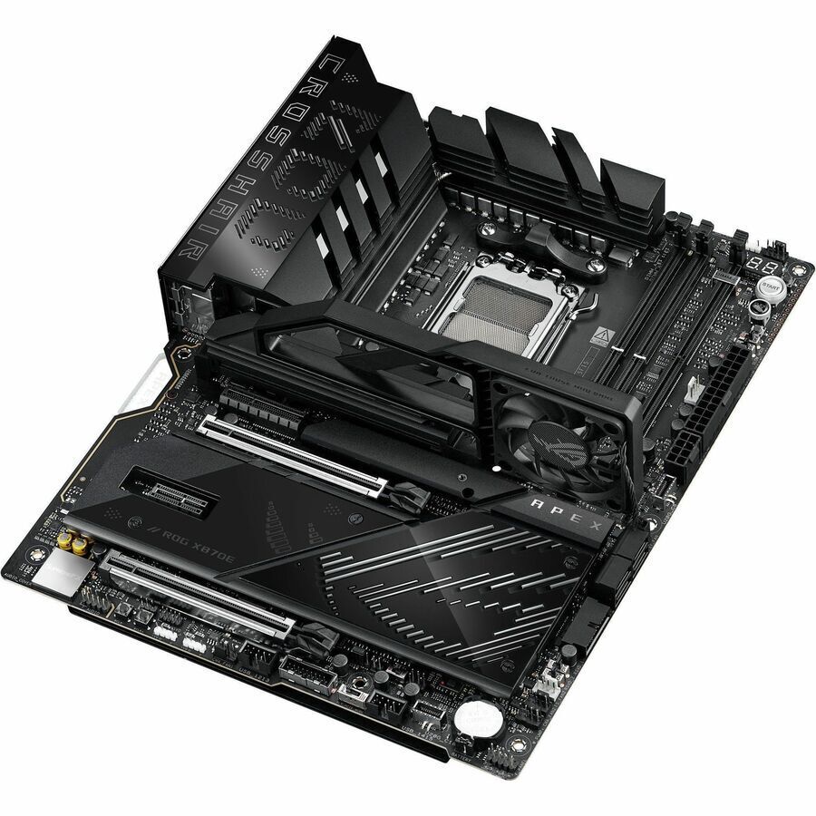 AMD X870E (AM5 Socket) ATX motherboard, Advanced AI PC-ready, 18+2+2 power stages, Dynamic OC Switcher, Core Flex, DDR5 slots with AEMP, ROG Memory Fan Kit for DDR5 overclocking, Wi-Fi 7 with ASUS WiFi Q-Antenna, three PCIe® 5.0 M.2 slots onboard, two PCIe 4.0 slots on an ROG DIMM.2 card, PCIe® 5.0 x16 SafeSlots with PCIe® Slot Q-Release Slim and full support for next-gen graphics cards, two USB4® ports, two USB 20Gbps Type-C® front-panel connectors (one with Quick Charge 4+ up to 60W and USB Wattage Watcher), AI Overclocking, AI Cooling II, and AI Networking II