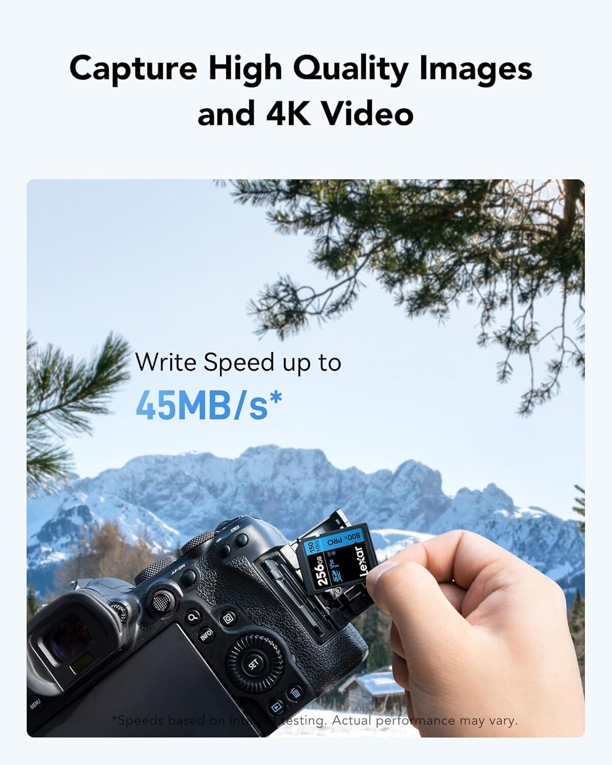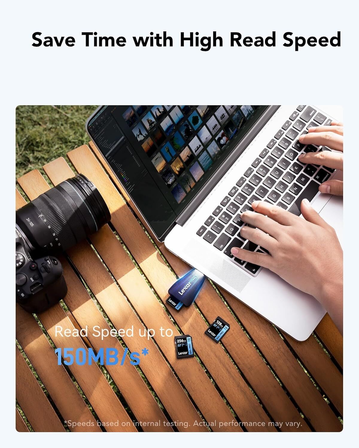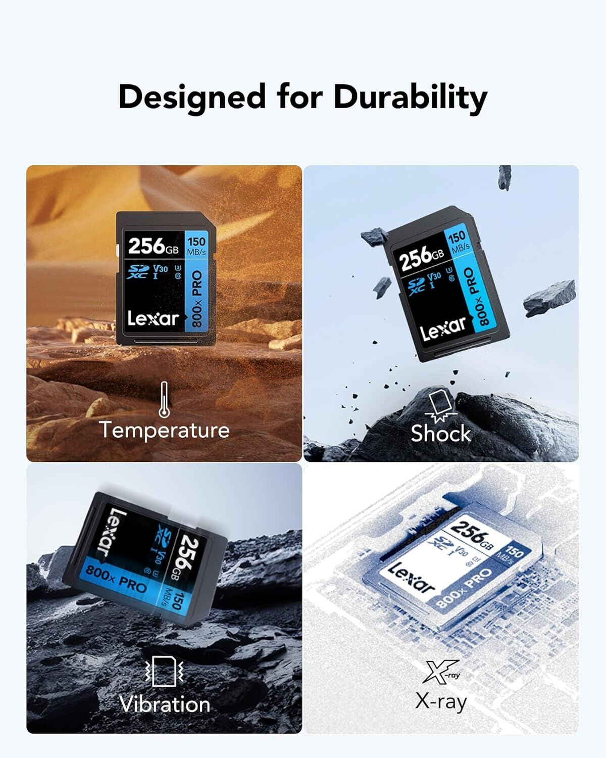 Lexar High-Performance 800x PRO SDHC™/SDXC™ UHS-I Cards BLUE Series are designed for point-and-shoot and mid-range DSLR cameras and HD camcorders. They feature fast transfer speeds of up to 150MB/s1 so you can perfectly capture and quickly transfer high-quality images and 4K UHD video2.