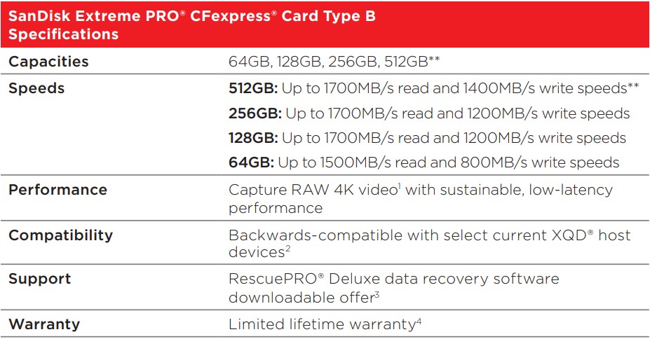 When you're shooting where the action is, the CFexpress Card Type B unleashes the RAW performance of your gear. With read speeds up to 1700MB/s and write speeds up to 1400MB/s, you'll get low latency during high-speed recording and an enhanced workflow efficiency that's far beyond anything existing SanDisk cards deliver. This card enables smooth, RAW 4K video capture with sustainable performance. Backward-compatible with select XQD cameras that adopt firmware enabling CFexpress,the card includes both Rescue PRO Deluxe Recovery Software and a limited lifetime warranty for added peace of mind.
