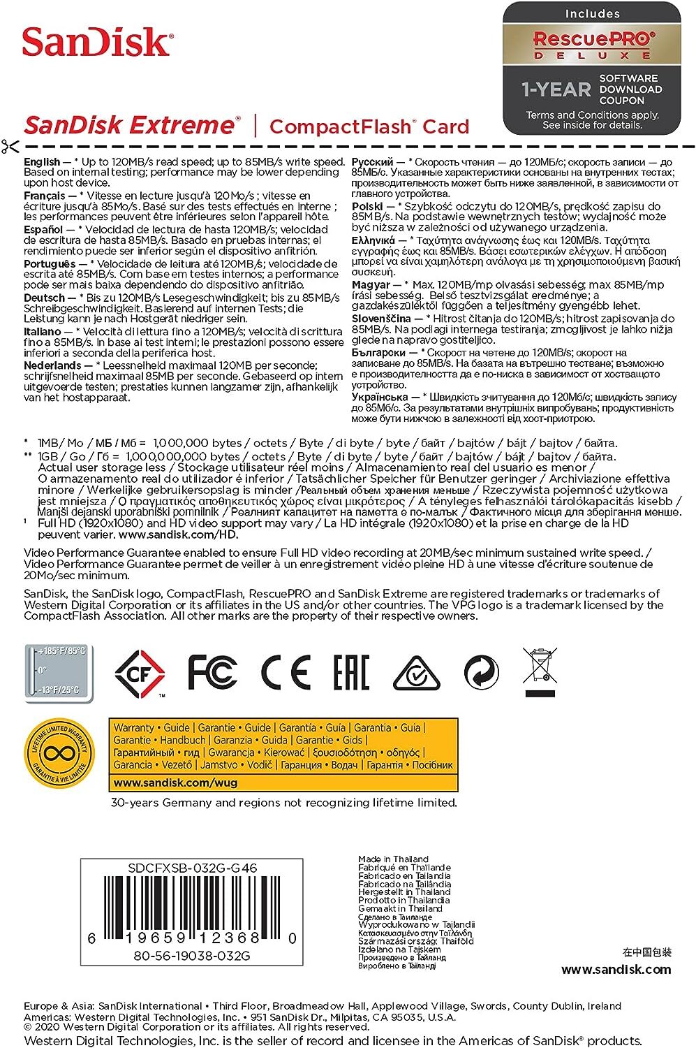 Ideal for use with mid-range to high-end DSLR cameras and HD camcorders, the SanDisk Extreme CompactFlash Memory Card delivers first-rate read/write speeds to catch fast action shots and enable quick file transfers. This memory card features Video Performance Guarantee (VPG-20) to deliver a minimum sustained recording data rate of 20MB/s to support high-quality Full HD video (1080p) recording. Take advantage of burst-mode photography with the card's write speeds of up to 85MB/s (567X) and enjoy efficient workflow with its transfer speeds up to 120MB/s. With capacities up to 128GB, this memory card provides plenty of storage for Full HD videos and RAW photos.
