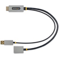 The HDMI to DP converter features a 1ft (30cm) cable between the HDMI and DP connectors, reducing strain on ports and connectors. The adapter includes an attached 1ft (30cm) USB-A cable for connecting to a nearby powered USB port or a USB wall charger.