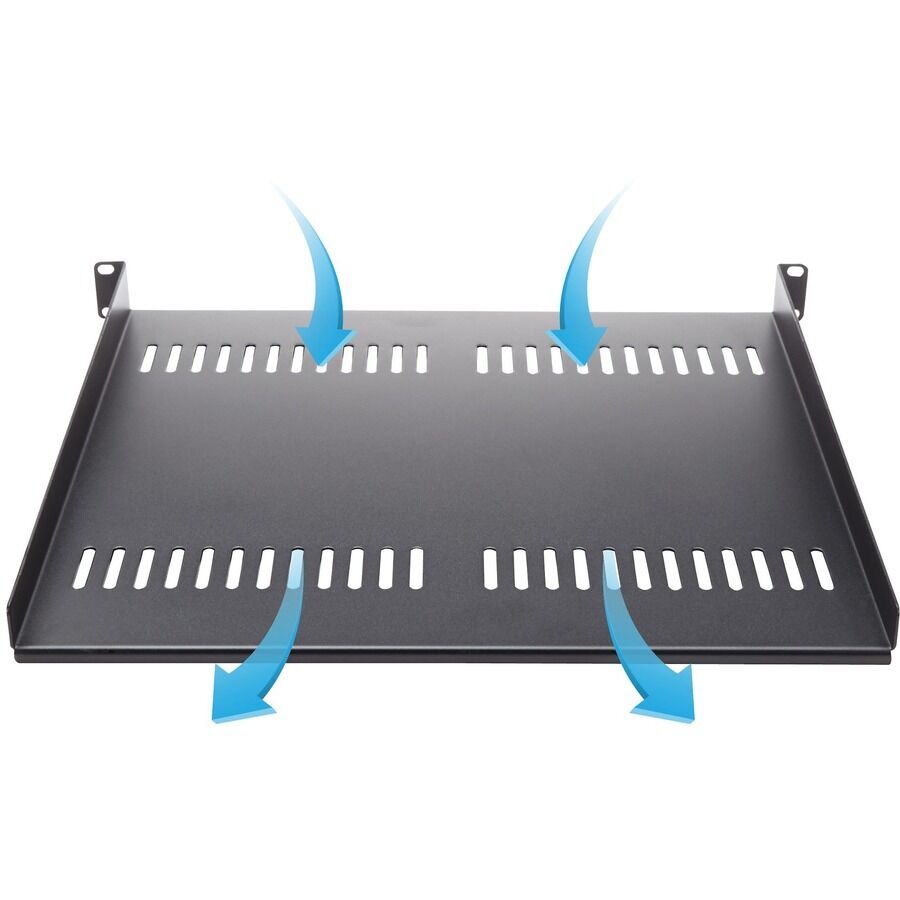 This 1U rack shelf lets you add 16 in. of flat storage space to any EIA-310 compliant server rack or cabinet. The shelf is vented to improve air flow and help lower temperatures in your rack.