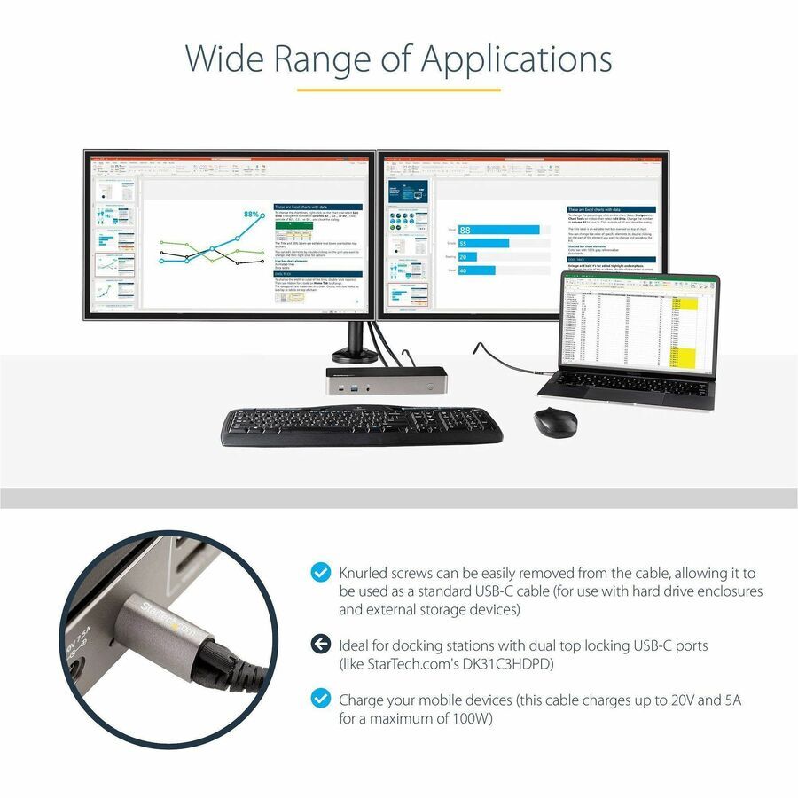StarTech.com 20in 50cm Top Single Screw Locking USB C Cable 10Gbps, USB 3.1 Type-C Cable, 5A/100W PD, DP Alt Mode, USB-C to C Cord - 20"/50cm USB-C to C Top Screw Locking cable; USB 3.2 Gen 2/10Gbps; up to 100W (5A) PD 3.0; DP 1.4 Alt mode; 8K 30Hz - Durable TPE jacket; Removable screw - 32AWG; Al-Mylar foil w/Braid - For StarTech.com's DK31C3HDPD; TB3/USB-C laptop MacBook/Surface