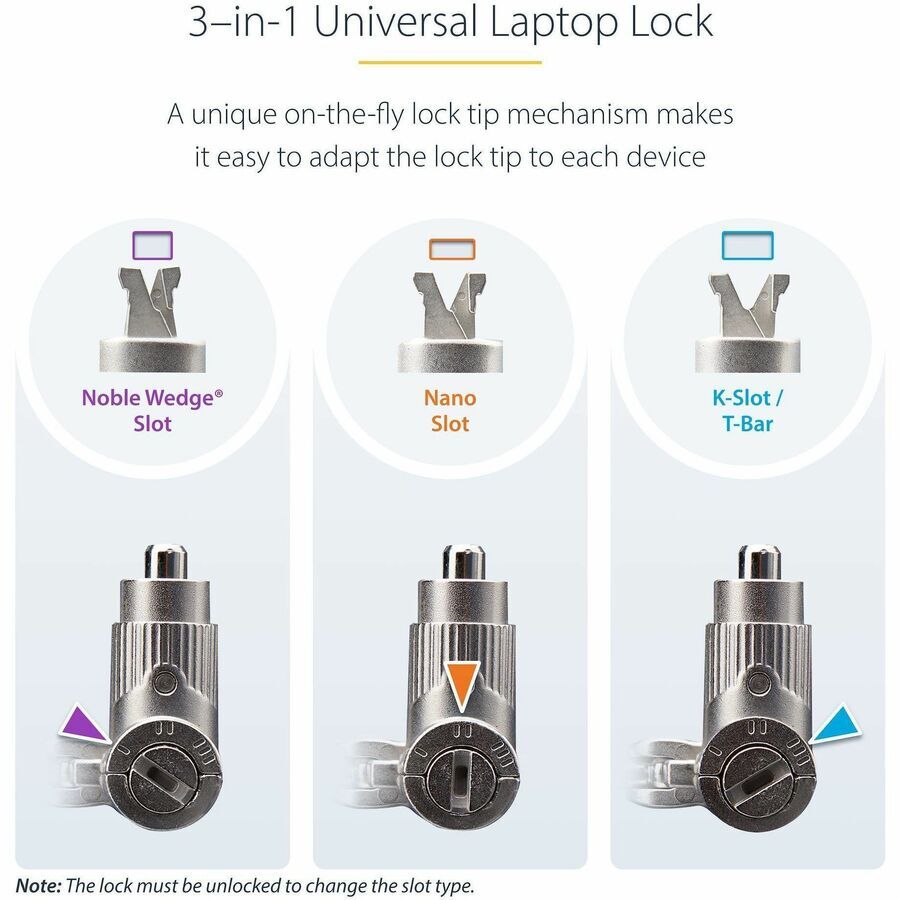 - 25-PACK UNIVERSAL 3-IN-1 LAPTOP LOCK: Compatible with Noble Wedge®; K-Slot (T-Bar), and Nano lock slots using an adjustable lock tip; 6.6ft (2m) and 0.17in (4.4mm) thick cut-resistant cable; Lock can withstand a pull force of up to 217lb (98kg)