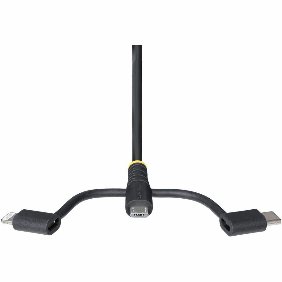 StarTech.com 3.3ft (1m) Rugged USB Multi Charging Cable, USB to Lightning/Micro-USB/Type-C, Apple MFi, Aramid Jacket, 3-in-1 Charger Cord - 3-in-1 Rugged USB Cable compatible w/portable devices; Apple MFi Certified Lightning; Supports USB-C and Micro-USB; Rugged cable design w/Aramid fiber; Flexible TPE jacket; Ideal for traveling/frequent use; Charge one device at a time; Up to 15W 3A