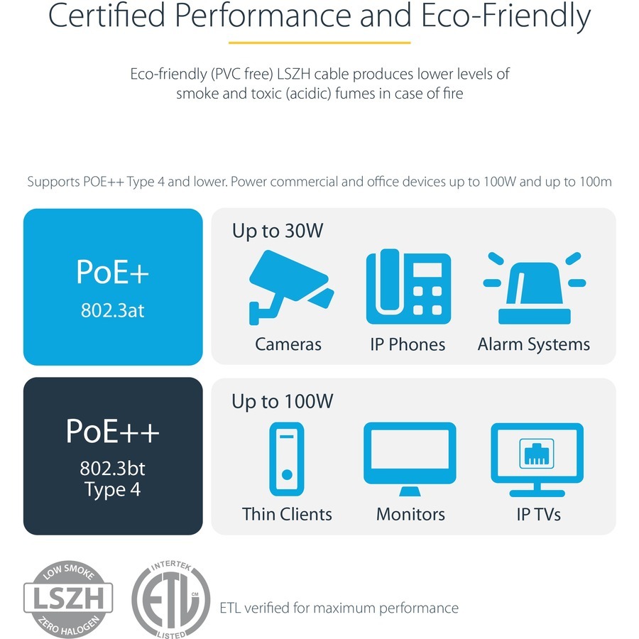 Low Smoke Zero Halogen (LSZH) Category 6 Snagless Network Patch Cable supports error-free Multi Gigabit connections: 1Gbps, 2.5Gbps, 5Gbps and 10Gbps (up to 160ft/55m). This PVC free high-performance cable offers reliable connectivity to all networking devices, such as Network Interface Cards (NIC), servers, routers, network attached storage (NAS), VoIP phones, PoE devices, etc.