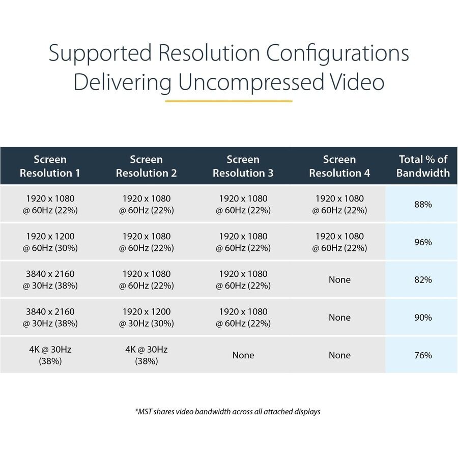 Note: MST shares 21.6Gbps across all attached displays. Higher resolutions can restrict the available bandwidth with the remaining ports, please see our guideline below for determining an ideal resolution for your setup.Certain graphics adapters have limited MST support and will only output to three displays in total. If more than three monitors are attached the fourth will be disabled.