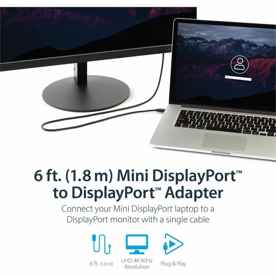 StarTech.com 6ft Mini DisplayPort to DisplayPort 1.2 Cable, 4K x 2K mDP to DisplayPort Adapter Cable, Mini DP to DP Cable for Monitor - 6ft Mini-DP to DisplayPort v1.2 cable; 4Kx2K(3840x2400 60Hz)/21.6 Gbps bandwidth/HBR2/8Ch Audio/MST - Durable PVC strain relief; Latching connectors - For office/boardroom with laptop/workstation and monitor/projector; Samsung/Sony/Dell
