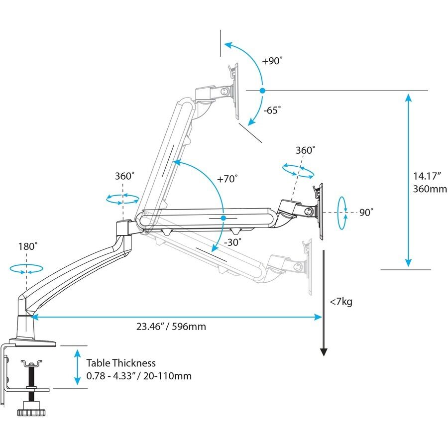 The full motion mount lets you extend the arm a full 23.46" (596 mm). Position your monitor for ideal viewing with the articulating monitor arm. You can tilt and swivel your display with a full range of motion across multiple axes. The spring-assisted height adjustment lets you raise or lower your monitor with smooth and effortless positioning. For viewing longer pages or blocks of code without having to scroll down your screen, the adjustable monitor arm also supports landscape-to-portrait display rotation.