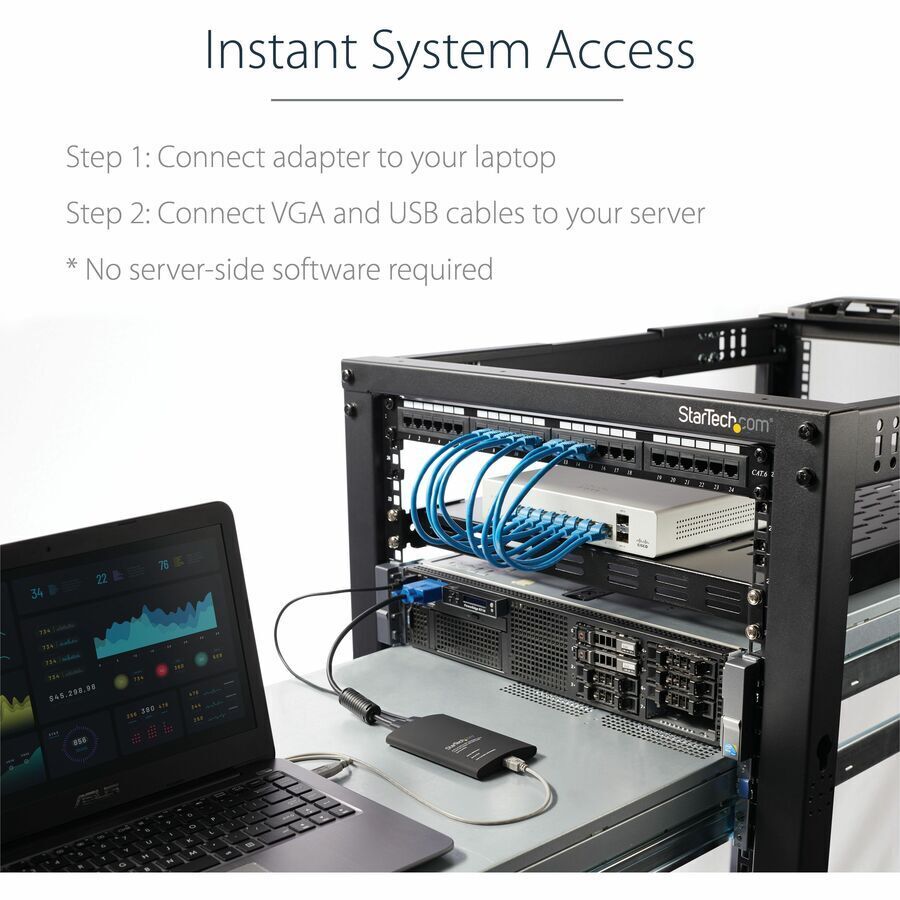 Simply connect the laptop crash cart adapter to your computer using the included USB cable, then connect the integrated USB and VGA cables to your server for instant BIOS-level control. With no server-side software required, you can be up and running instantly.