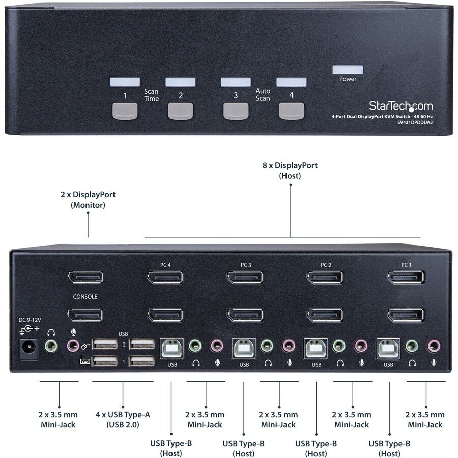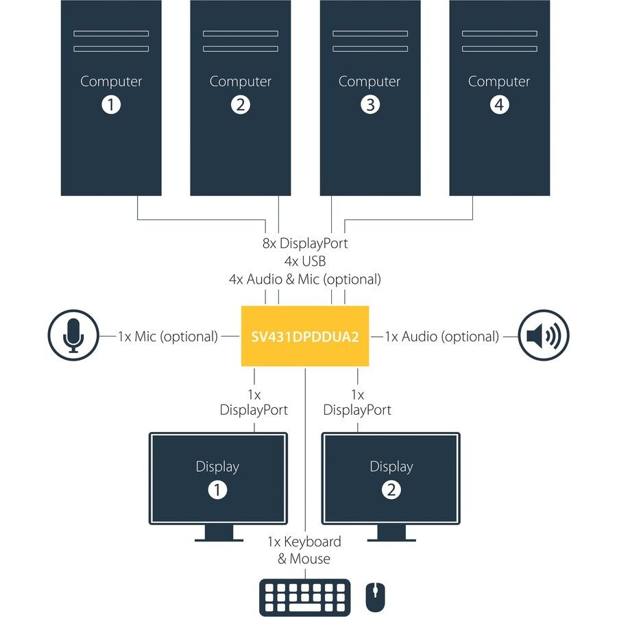 StarTech.com KVM Switchbox - TAA Compliant - 4 Computer(s) - 1 Local User(s) - 3840 x 2160 - 8 x USB - 10 x DisplayPort - 2U - Rack-mountable, Desktop
