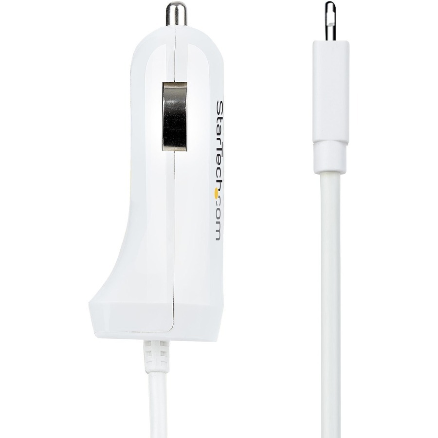 StarTech.com Lightning Car Charger with Coiled Cable, 1m Built-in Cable, 12W, White, 2 Port USB Car Charger Adapter, In Car iPhone Charger - Dual USB car charger charges two mobile devices up to 2.1A simultaneously; Built-in coiled Lightning cable provides a tangle free environment in vehicles; Charge tablets and Lightning devices at the same time; Fits in an auxiliary power outlet