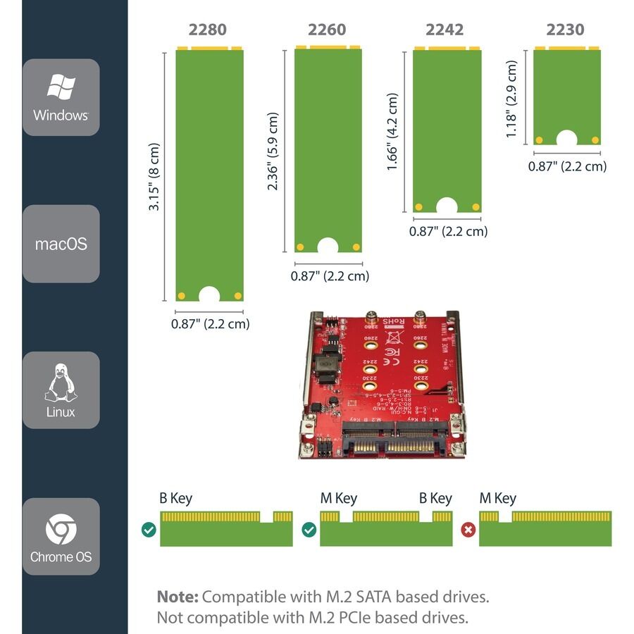 StarTech.com M.2 to SATA Adapter - TAA Compliant - Create high-performance storage with RAID by installing two M.2 SATA SSDs into a 2.5" SATA interface - M.2 Drive to SATA Adapter - Supports B key M.2 SATA SSDs - RAID 0, 1, spanning, JBOD - M.2 Adapter / M.2 SSD Adapter