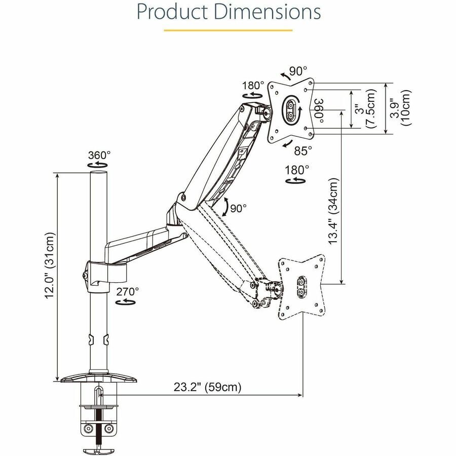 StarTech.com Mounting Arm for Flat Panel Display, Monitor, Curved Screen Display - Height Adjustable - 1 Display(s) Supported - 81.3 cm to 124.5 cm (49") Screen Support - 8 kg Load Capacity - 75 x 75, 100 x 100 - VESA Mount Compatible - Steel