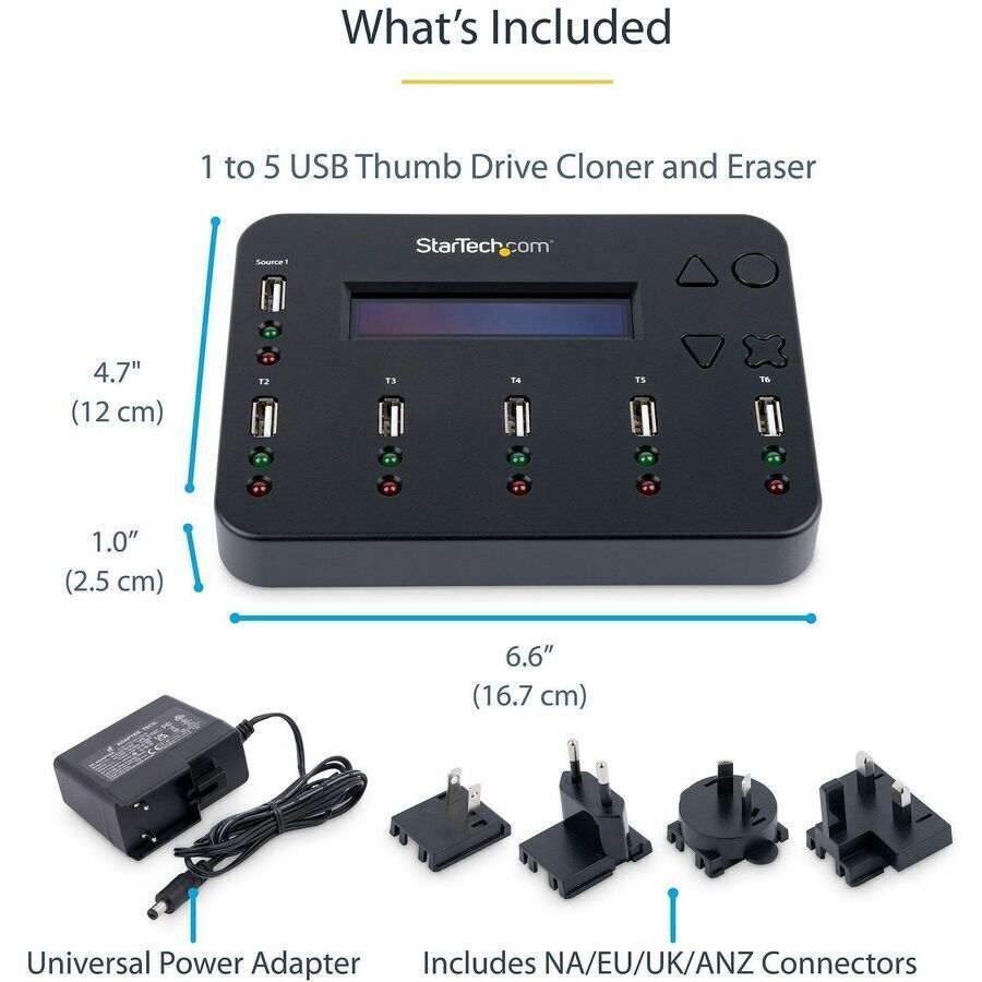 StarTech.com Standalone 1 to 5 USB Thumb Drive Duplicator/Eraser, Multiple Flash Drive Copier, 1.5 GB/min Sector-by-Sector, 3 Erase Modes - 1 to 5 Standalone USB Flash Drive Duplicator/Eraser, Cloner/Sanitizer; Supports USB 3.0/2.0 Thumb Drives; Up to 1.5 GB/min System-and-File and Sector-by-Sector Copy; Single and 3-Pass Erase (DoD / NIST SP 800-88 Rev1 clear), no computer required; TAA
