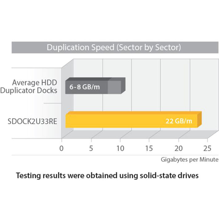 Fast PerformanceWith support for SATA III (6 Gbps) you can maximize efficiency with duplication speeds up to 22 GB per minute, and eSATA docking speeds up to 6 Gbps. The Dock can also be connected through USB 3.0 with UASP for transfer speeds up 5 Gbps (70% faster than conventional USB 3.0). See our UASP testing results below for further details.