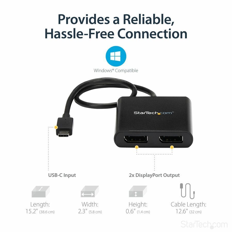 StarTech.com USB-C to Dual DisplayPort 1.2 Adapter, USB Type-C Multi-Monitor MST Hub, Dual 4K 30Hz DP Display Extender/Splitter, Windows - USB Type-C Multi-Monitor adapter drives dual4K 30Hz or 1080p 60Hz DisplayPort displays in extended/mirrored mode; DP 1.2/HBR2 MST Hub / Splitter; TB3/TB4/USB4 Compatible; Extra-long 1ft cable reduces USBC connector strain; Windows Only/No drivers
