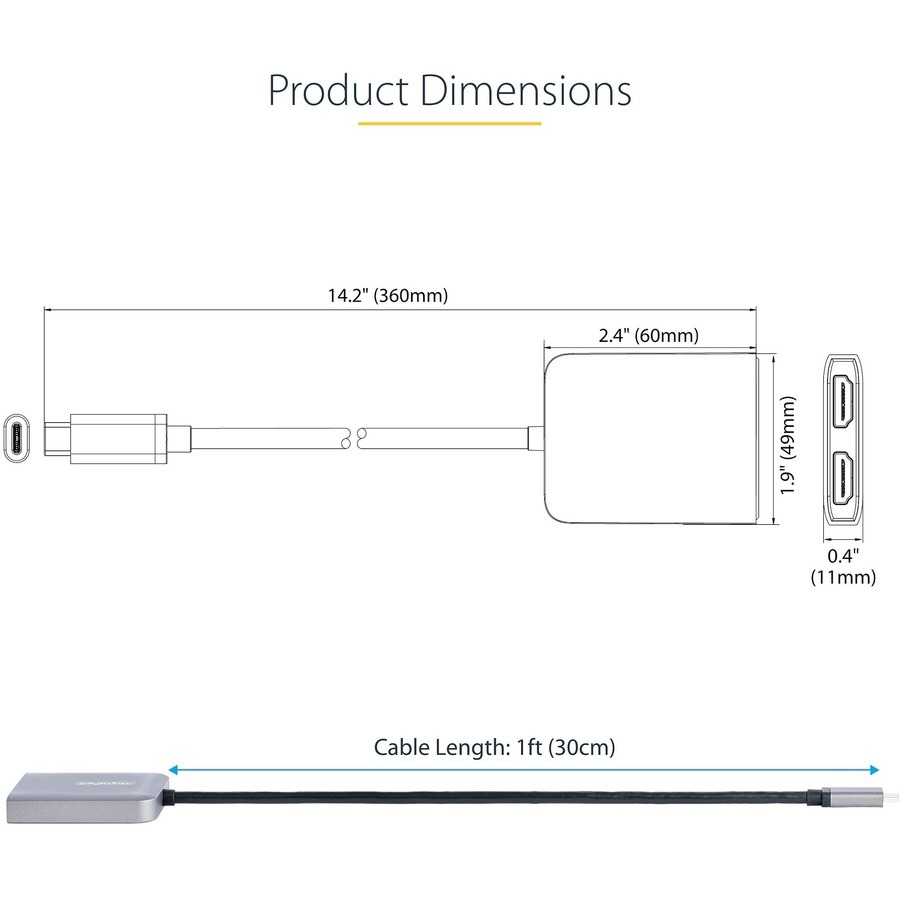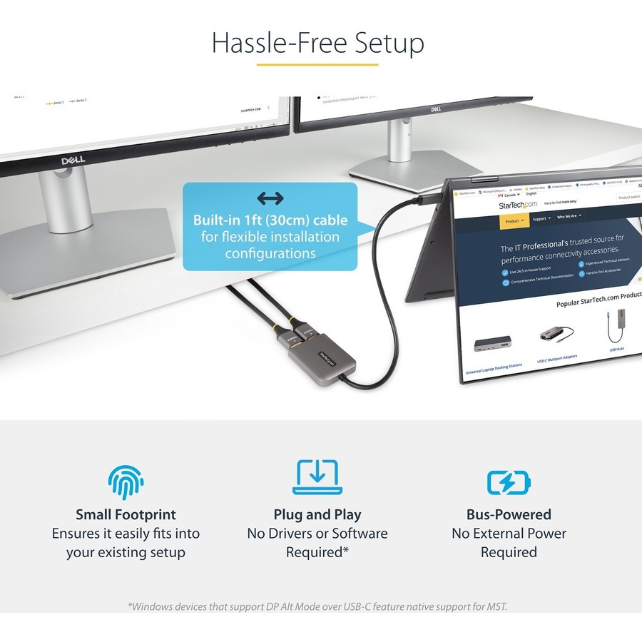 Windows devices that support DP Alt Mode over USB-C feature native support for MST. This USB-C to HDMI hub is compatible with Thunderbolt 4, Thunderbolt 3, and USB4 enabled Windows devices. Plug-and-play installation with no drivers or software required. The 12in (30cm) attached cable provides options for flexible installation configurations, reducing the amount of strain on ports and connectors. Additionally, this dual-monitor splitter is bus-powered, meaning no external power is required.