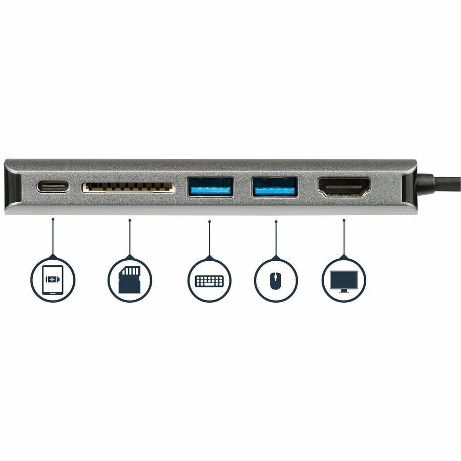 StarTech.com USB Type C Docking Station for Notebook - Memory Card Reader - SD, SDXC, SDHC - 60 W - Black, Grey - 1 Displays Supported - 4K - 4096 x 2160, 3840 x 2160, 2560 x 1600, 2560 x 1440 - 3 x USB Ports - 3 x USB 3.0 - USB Type-A - USB Type-C - Network (RJ-45) - 1 x HDMI Ports - HDMI - Thunderbolt - Wired - Gigabit Ethernet - Windows 7, Windows 8, Windows 8.1, Windows 10, Windows 11, Mac OS X 10.11 El Capitan, Mac OS X 10.15 Catalina, Mac OS X 11.0 Big Sur, Mac OS X 12.0 Monterey, Mac
