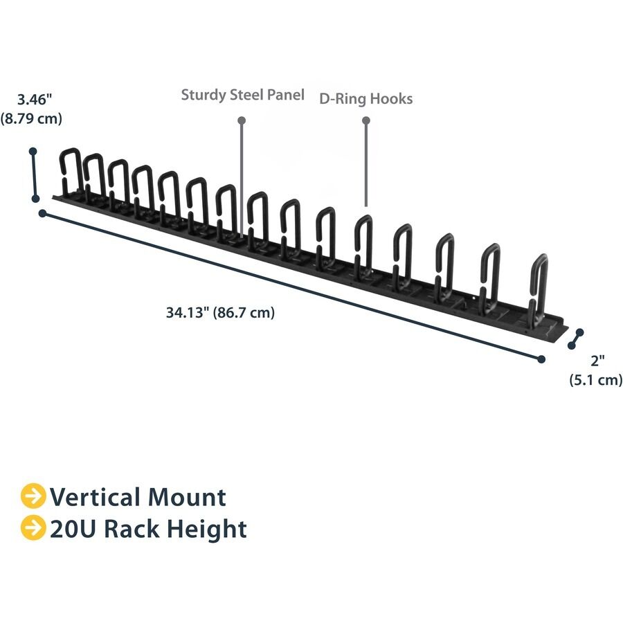 StarTech.com Vertical Cable Organizer with D-Ring Hooks - Vertical Cable Management Panel - 20U - 2.8ft. - Eliminate cable stress in your rack while making equipment easier to access, w/ this 2.8ft vertical cable management panel -Rackmountable cable manager - 20U vertical mounting - Get passive cooling in your rack by organizing cables to improve airflow