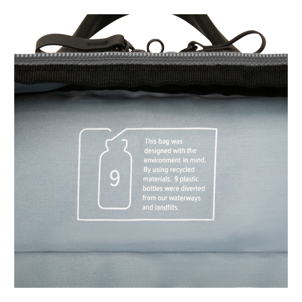 By using GRS-certified recycled materials, 9 plastic bottles were kept out of our waterways and landfills, shredded into small flakes, re-polymerised into plastic pellets, and heated and spun into yarn that was stitched, and sewn into the fabric of this EcoSmart® bag.