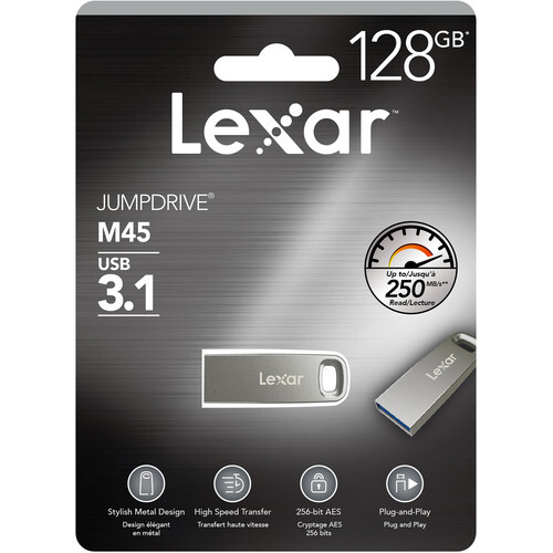 Store your data with the stylish Lexar JumpDrive M45 USB 3.1 Flash Drive. The metal finish serves as both an elegant design and durable protective cover for your files. With fast USB 3.1 transfer speeds up to 250MB/s read, you'll quickly transfer files, photos, and videos in no time. Available in capacity options from 32GB to 256GB.
